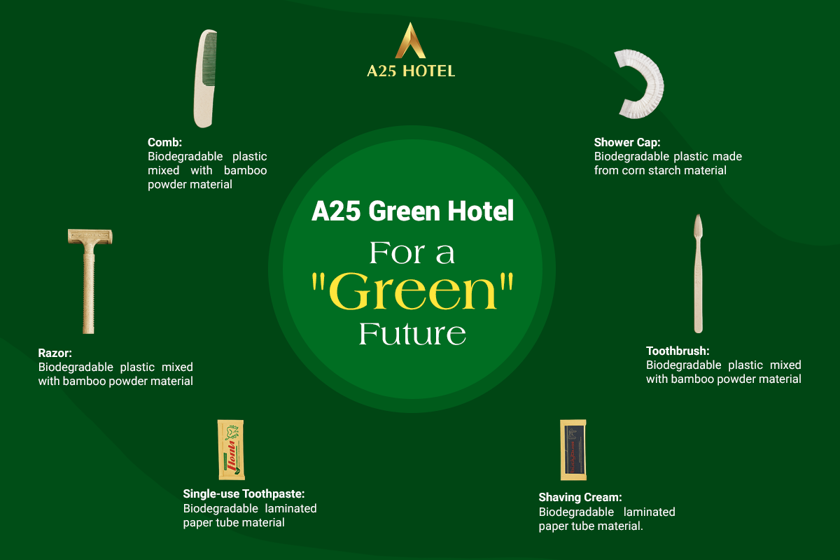Single-use items at A25 Hotel will be progressively transitioned to greener and safer materials such as bamboo powder, corn starch bioplastics, and biodegradable paper, helping reduce plastic waste and protect the environment: