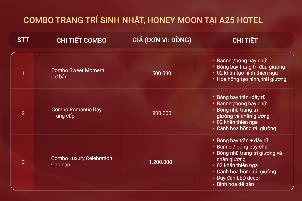 Để được tư vấn chi tiết về các gói combo trang trí Sinh nhật - Honeymoon và hỗ trợ đặt dịch vụ theo nhu cầu, Quý khách vui lòng liên hệ trực tiếp với A25 Hotel.