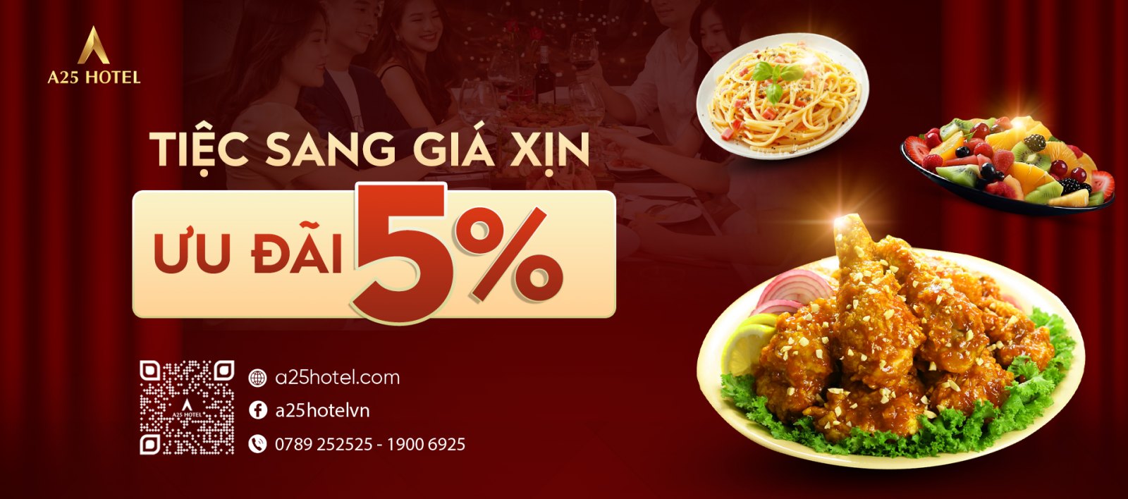 - Ưu đãi: 5% tiền phòng khi khách hàng sử dụng dịch vụ tại A25 Bistro với hóa đơn từ 299.000 VNĐ.